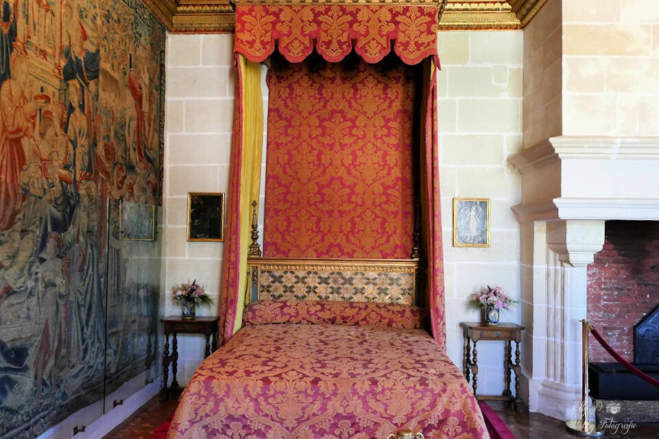 We nemen eerst een kijkje in de slaapkamer van Diana van Poitiers de maitresse van de koning het bed en de Vlaamse wandtapijten