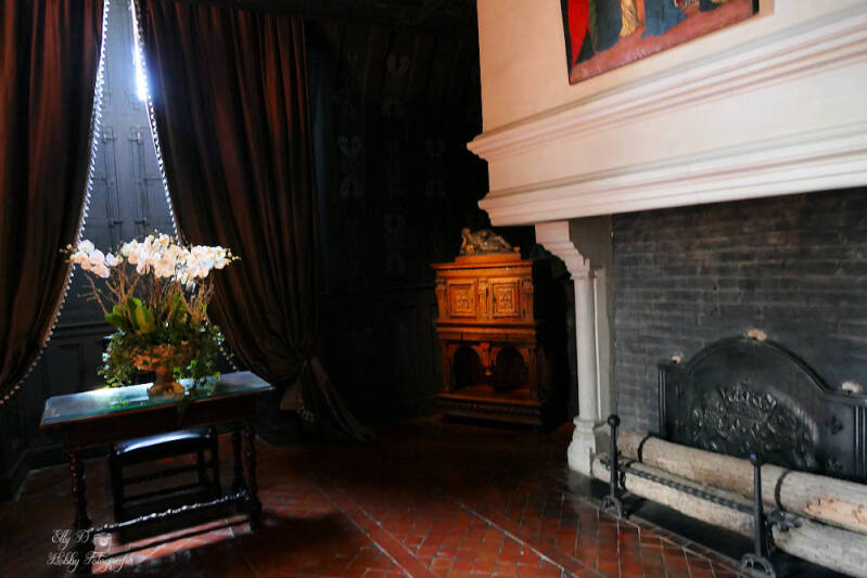 De slaapkamer van Louise van Lotharingen ..het was er ok heel donker gemaakt gordijnen dicht om de sfeer weer te geven dat hier een koningin in het wit gekleed rouwde om de dood van haar man Koning Hendrik de 3e in 1589