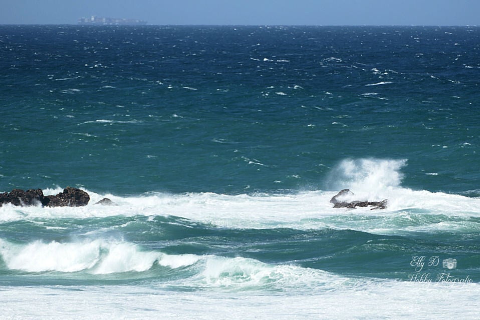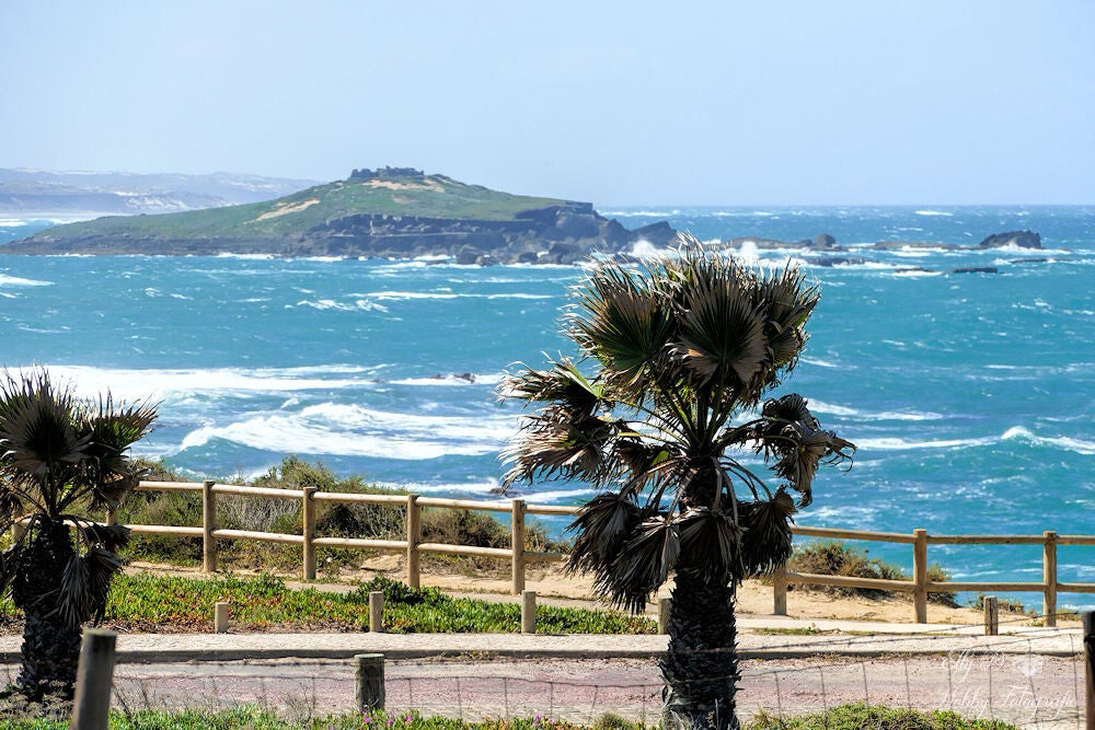 Het waait hard , Het eiland Pessegueiro ligt daar een stukje verderop.