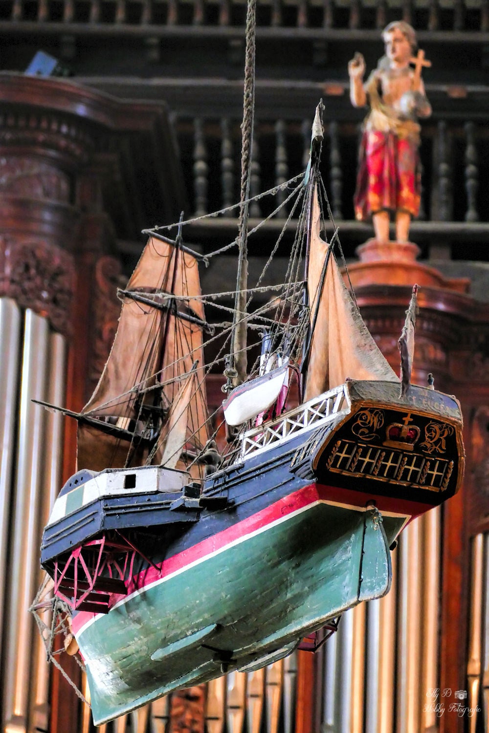 Hangend aan het gewelf, een schip met het wapen van keizerin Eugénie. De legende verteld dat de keizerin de boot schonk aan de matrozen als dank dat ze haar redden van een schipbreuk .